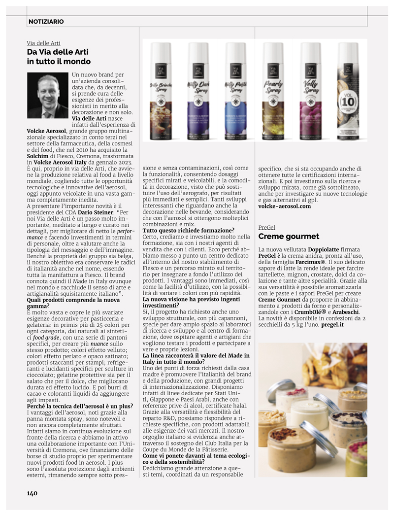 Su “Pasticceria Internazionale”, la rivista per pasticcieri, gelatieri, cioccolatieri, Dario Steiner, il presidente del CDA presenta la nuova gamma di prodotti Via delle Arti®, il brand nato dall’esperienza di Volcke Aerosol e illustra la vision aziendale tra sostenibilità e formazione.